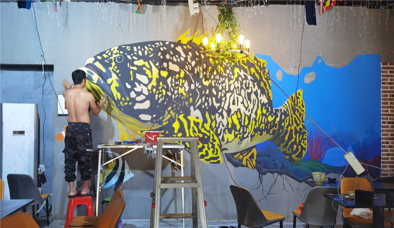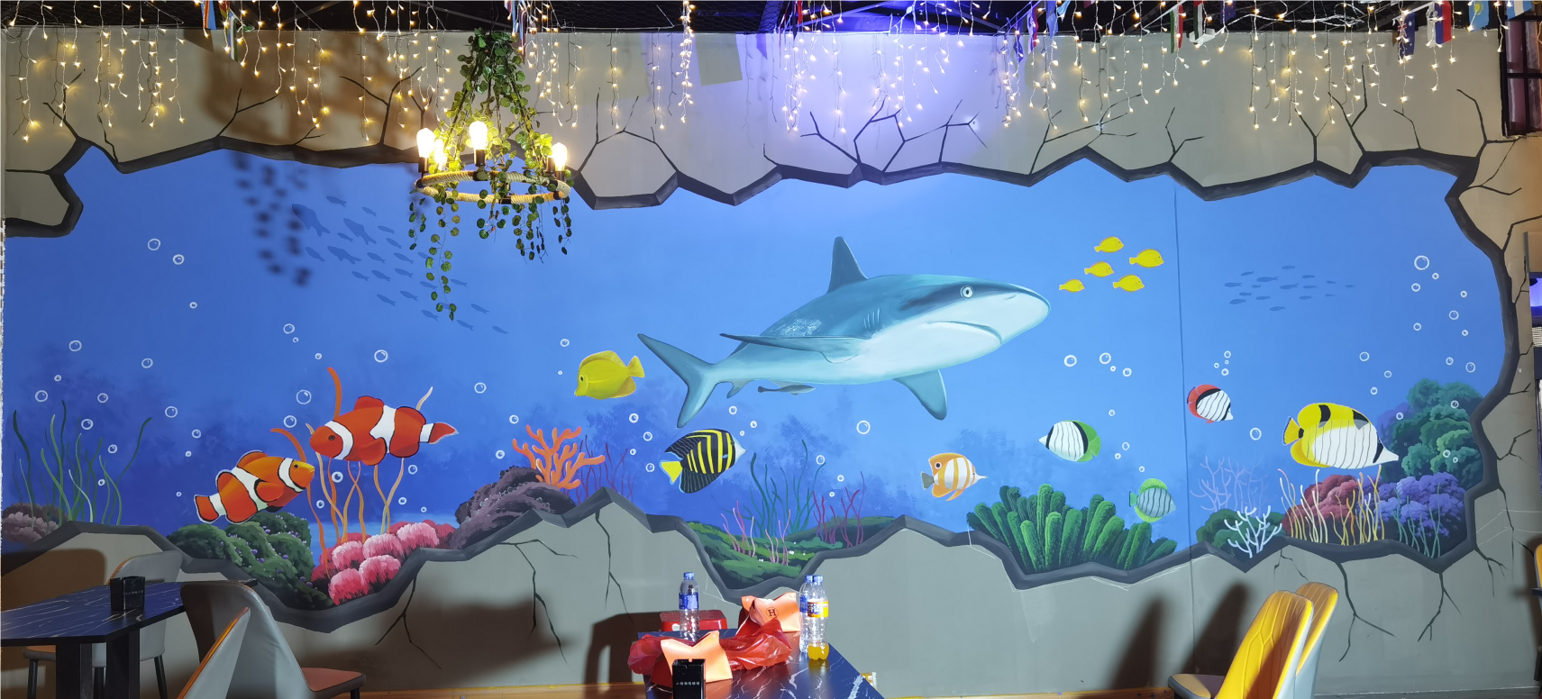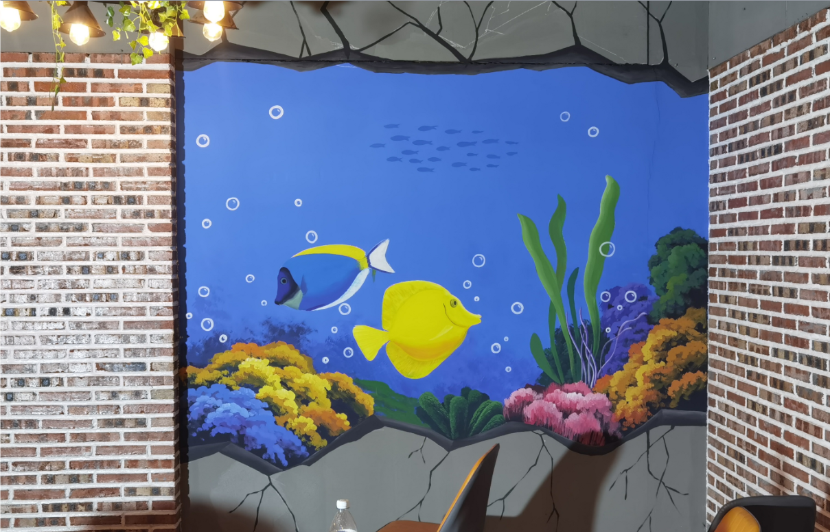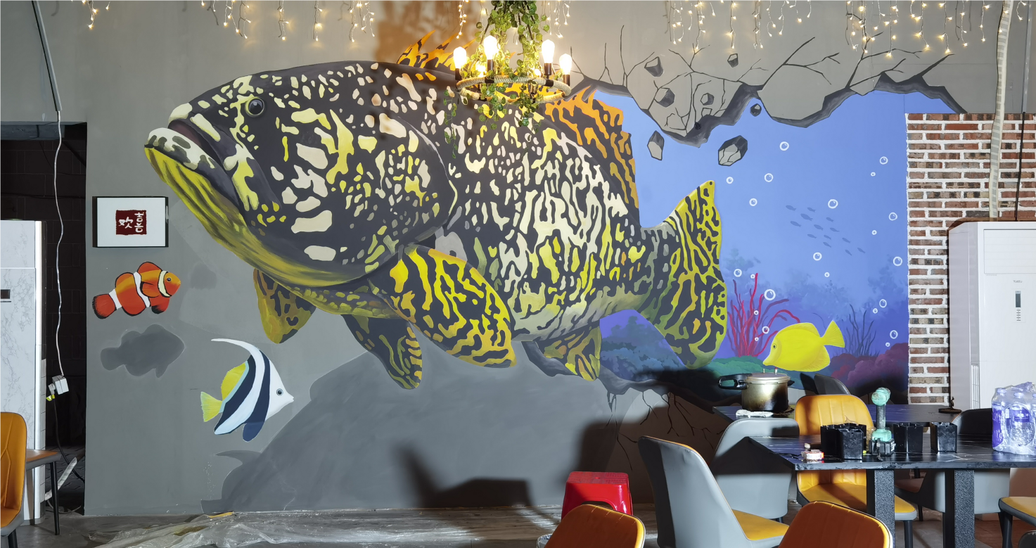 3D手绘鱼,烧烤店墙绘,店面涂鸦,立体画彩绘